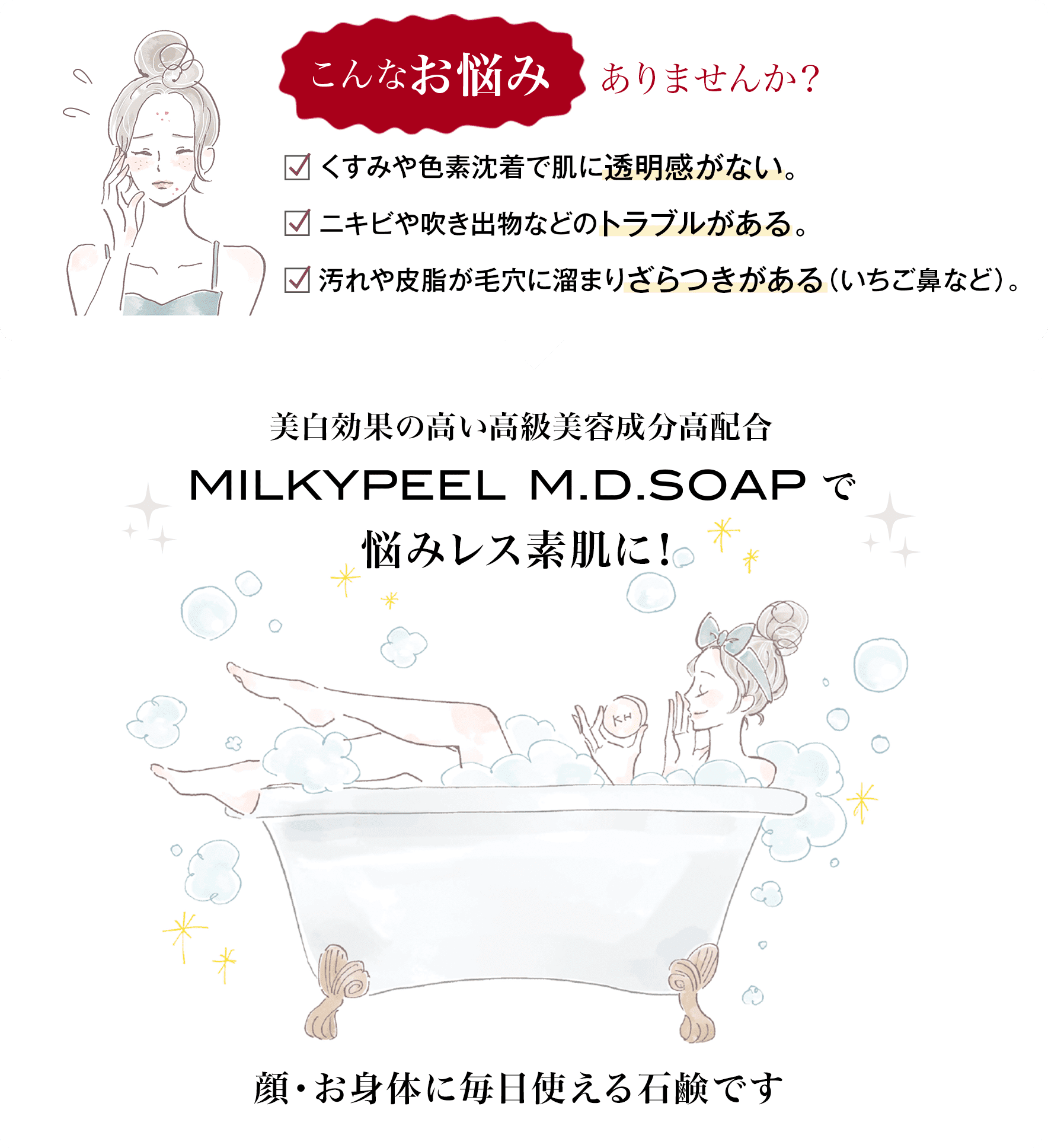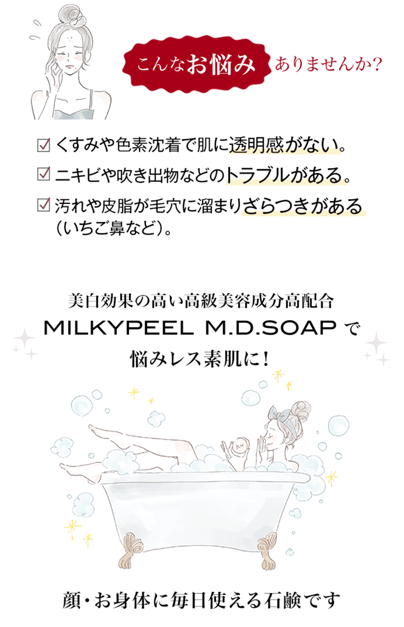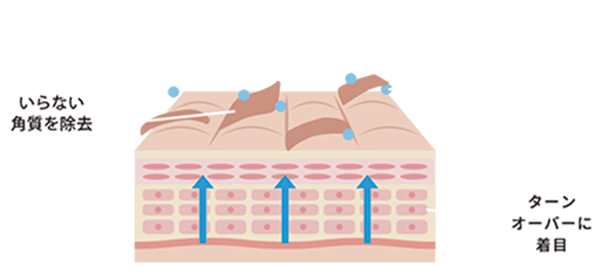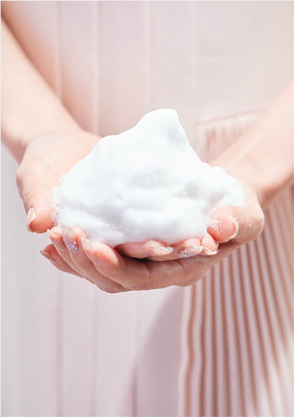 肌表面に残る古い角質を取り去り、新しい肌の生まれ変わりをサポートする角質ピーリング成分、乳酸*⁴7%+グリコール酸*⁵3%=計10%を配合。綺麗にすることへのこだわりが国内でも屈指の高配合率を実現しました。今までのピーリング石鹸が合わなかった方、実感できなかった方もぜひお試しください。