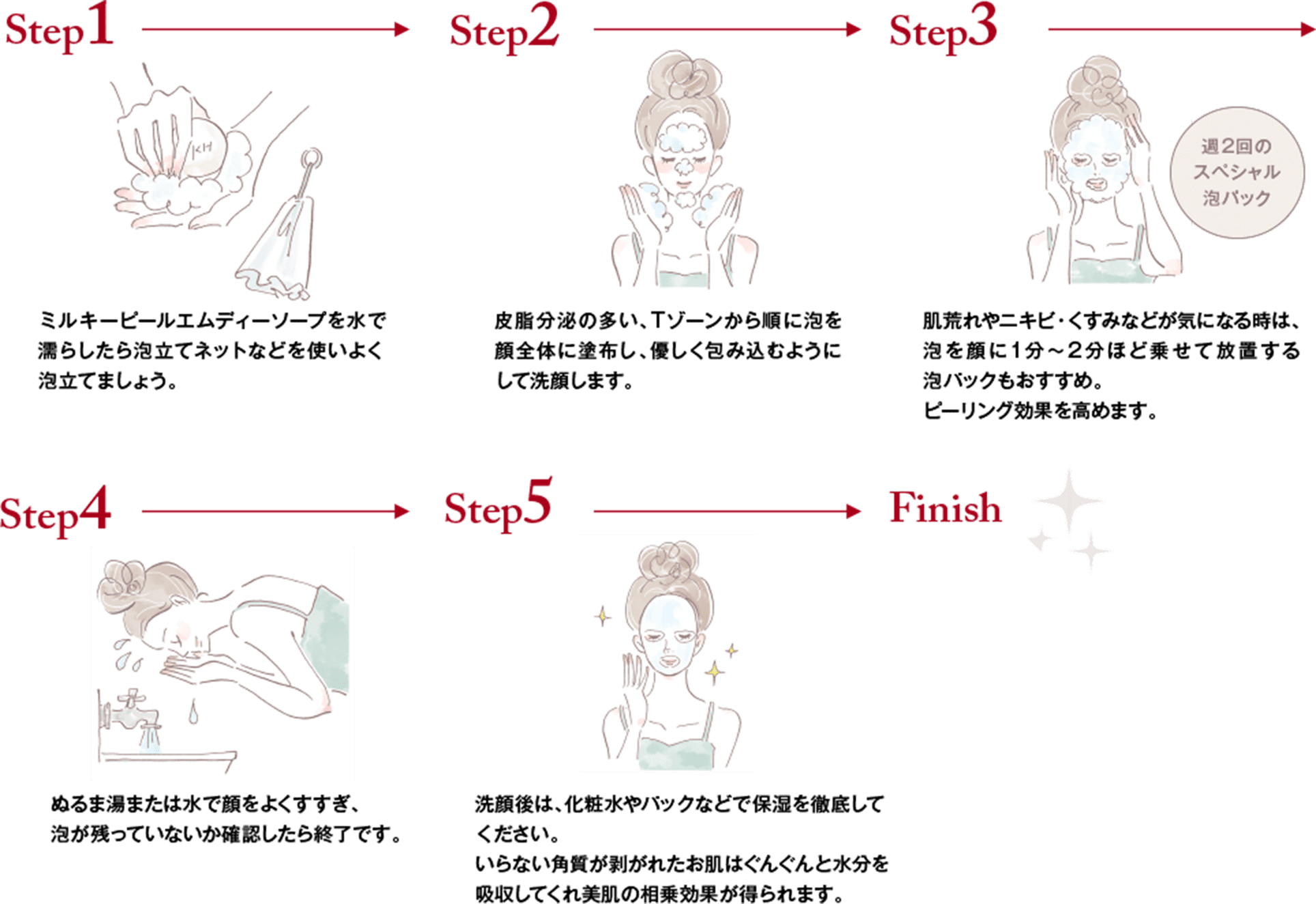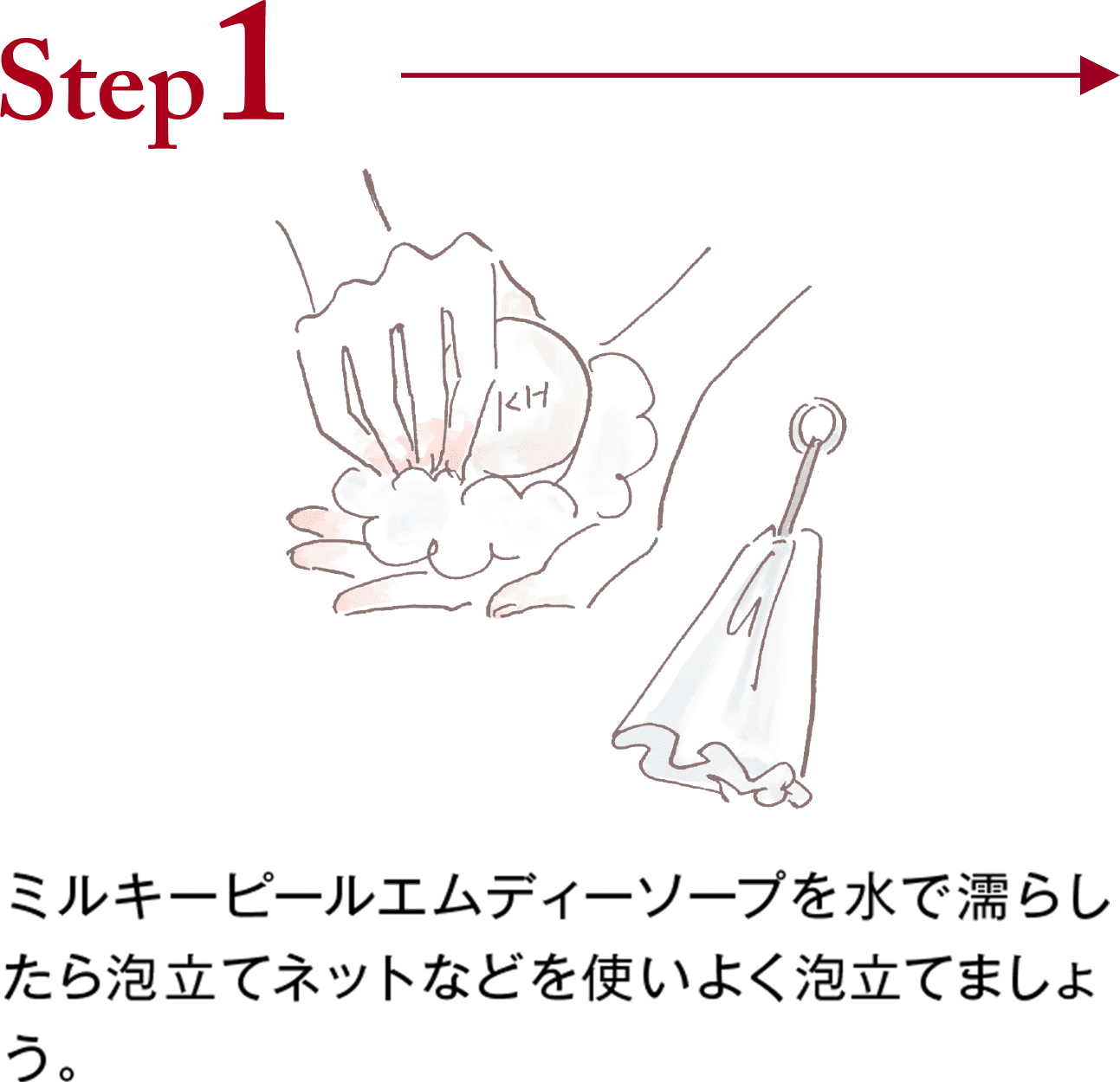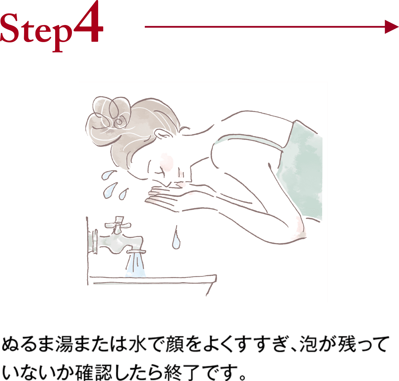 - 石鹸で落ちないメイクアップをされている方はまずクレンジングをしていただき、そのあとに本製品をご使用ください。石鹸で落ちるメイクアップ製品をお使いの方は、クレンジングは必要ありません。