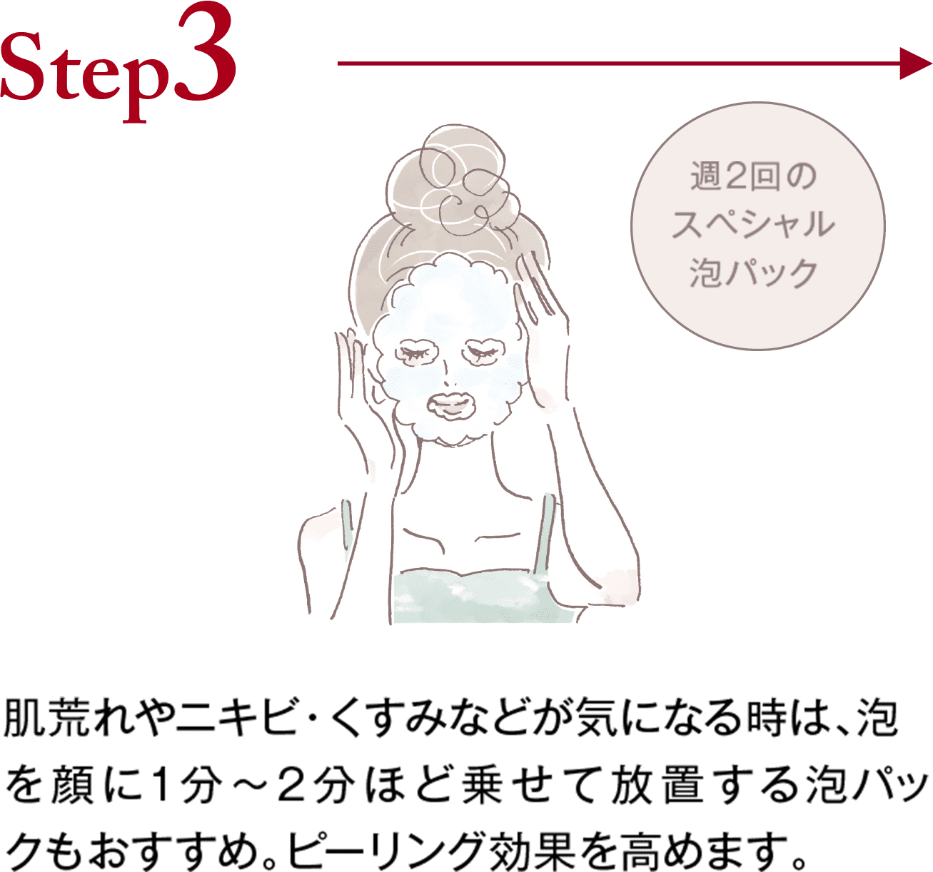 - 朝の洗顔、夜は顔だけじゃなく、全身のケアとして毎日使用してください。洗顔の場合は、基本的に夜は毎日しっかりと。朝は、もし肌が乾燥している季節やタイミングのときはぬるま湯ですすぐ程度がお肌に良いと考えておりますが、皮脂分泌が多くなる気温の高い季節は朝も本製品でしっかりと洗顔し、汚れを落とすことから綺麗が始まります。