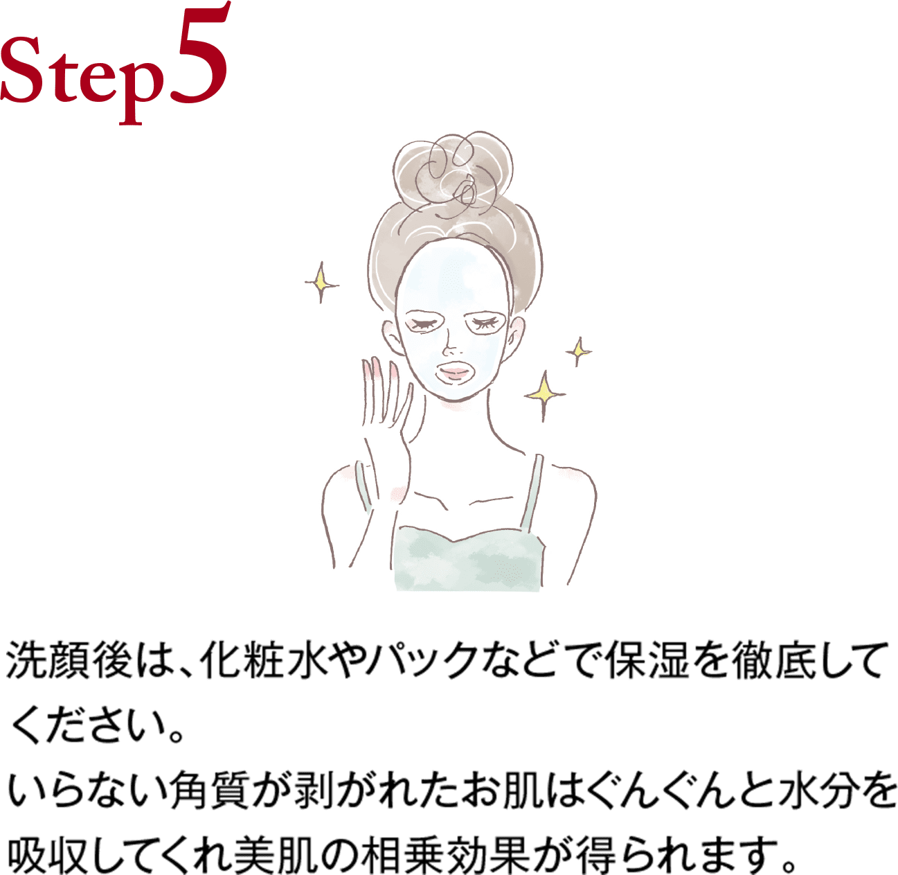 - 古い角質をすっきりと洗い流すため、ツッパリ感や乾燥を感じる方もいらっしゃいます。化粧水やパックなどを塗布し、保湿もセットで行なってください。