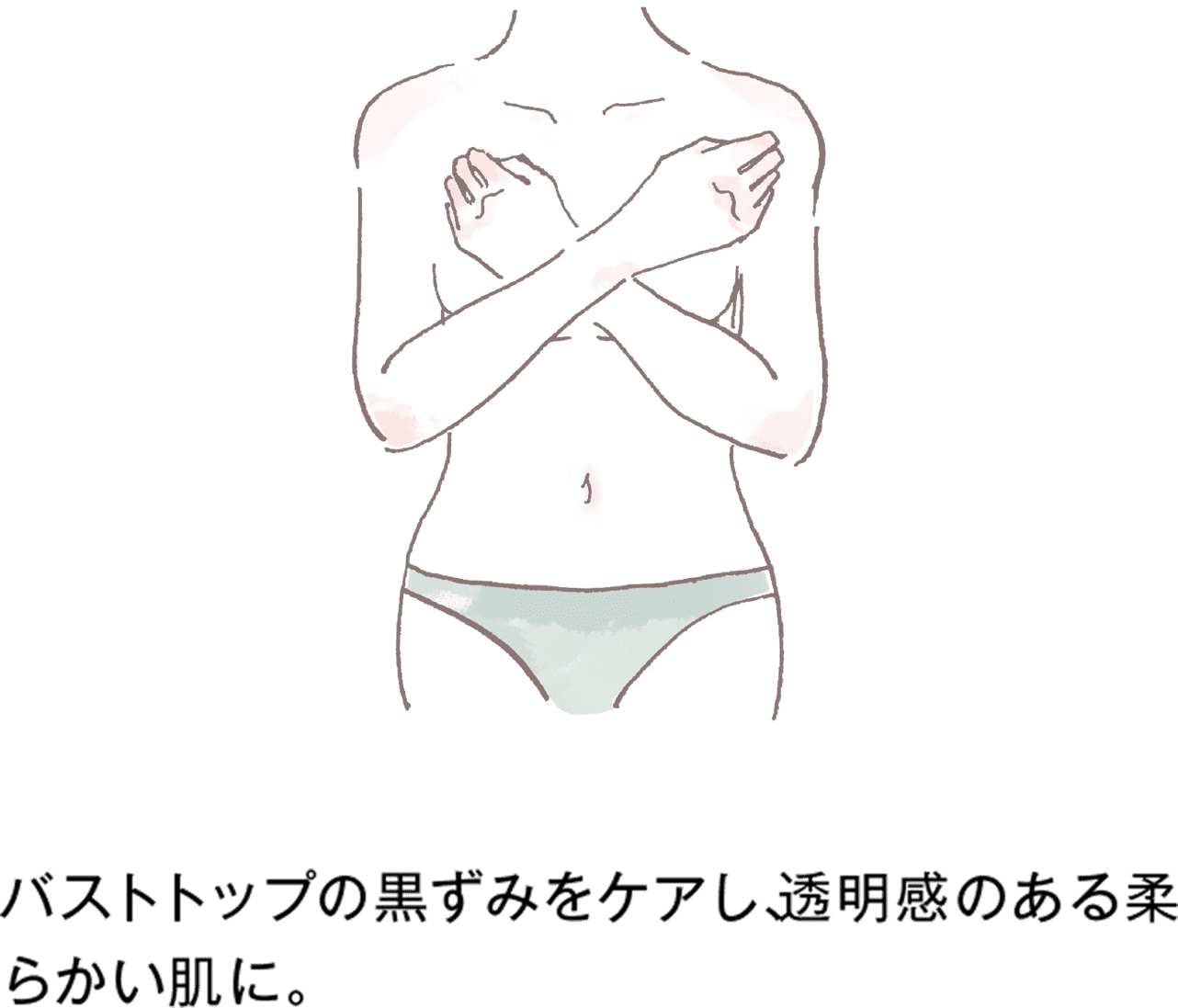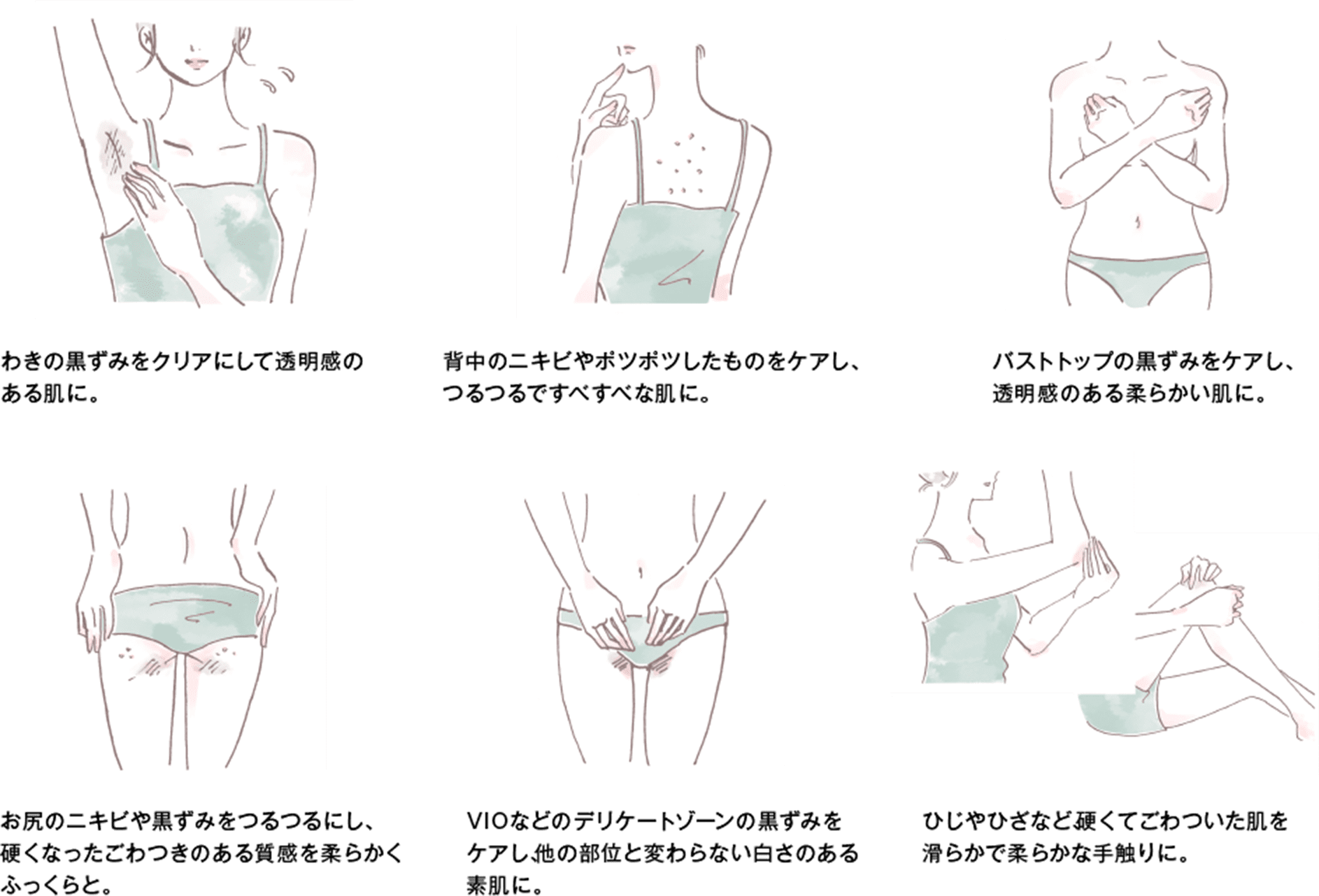 ハイドロキノン*⁶、アルブチン*⁷、プラセンタ*⁸、3種類の有用成分を贅沢に配合しました。この3種類の成分は、化粧水や美容液などでも多く使用される代表的なお肌にうれしい成分です。徹底した白肌の追求に、お顔だけでなく、ひじやひざ・脇・バストトップ・お尻・デリケートゾーンなどの黒ずみケア、色素沈着したパーツなどへの対策など、ボディー(全身)のスキンケアの1つとしてご使用ください。週に2回ほどの泡パックもおすすめです。