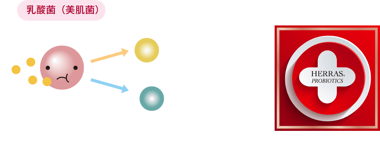 ラ・フローラEC-12*3400億個配合ヒトの皮膚には1兆匹以上の皮膚常在菌が住んでいます。この多種多様な菌が存在する肌フローラ(皮膚常在菌)は、肌表面や毛穴まわりの保湿成分,pH,免疫などの調節により皮膚のバリア機能に関わっています。 毎日使用するスキンケアだから、HERRASはこの皮膚常在菌に着目しました。様々な乳酸菌の中でも厳選して選んだ人由来美肌菌のラ・フローラEC-12は、加齢により減少するうるおい乳酸菌(表皮ブドウ球菌)を育て、自らの肌フローラに働きかけ、敏感肌やトラブル肌のバリア機能をサポートします。