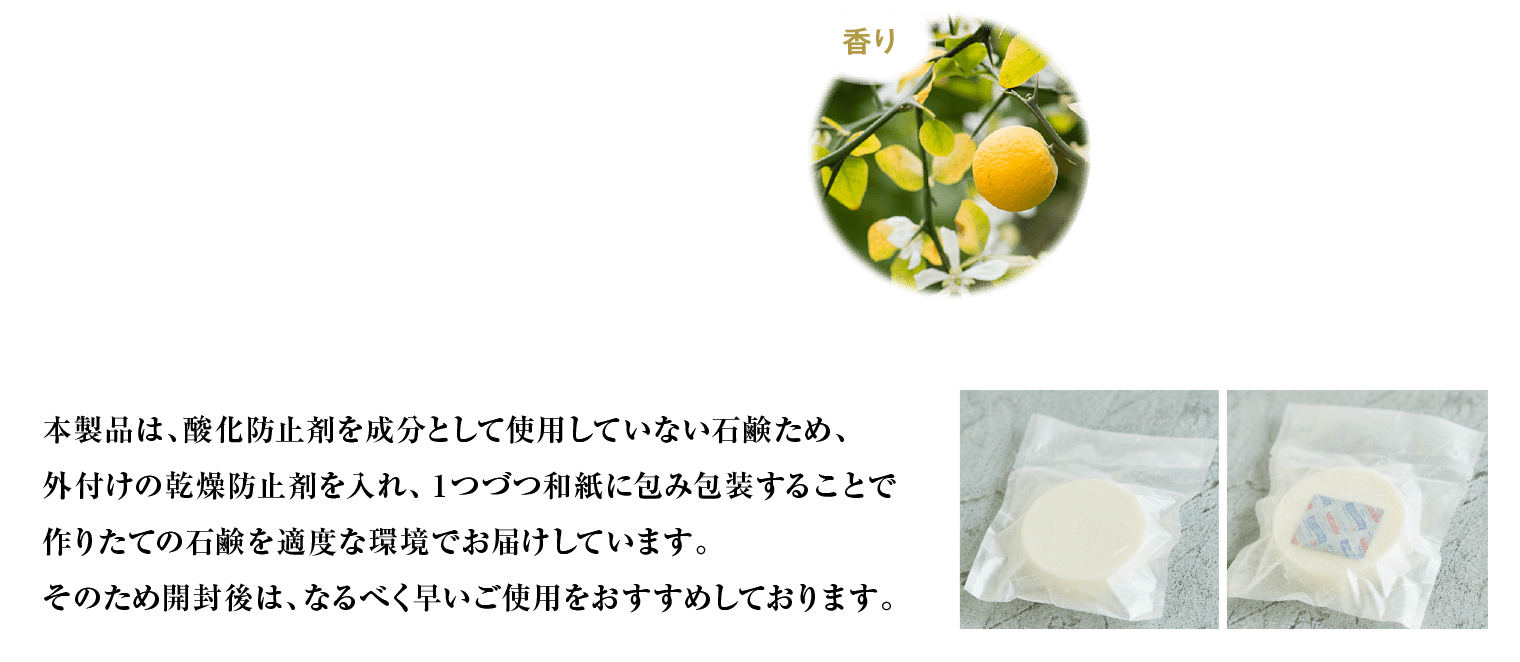 時に肌は化学成分で刺激を感じることがあります。そのため当製品は肌に必要のない、化学合成成分・パラベン・防腐剤・酸化防止剤・合成着色料・合成香料を全て徹底排除し、敏感肌の方でも安心して使用できる処方にしました。そのため、少しデリケートな石鹸。激しく乾燥した場所での保管は控え、開封後は、毎日のご使用をおすすめしています。